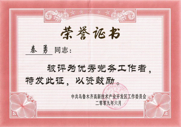 在2009年6月30日高新區(qū)召開的慶祝建黨88周年表彰大會上。準(zhǔn)油股份董事長 黨委書記秦勇被評為優(yōu)秀黨務(wù)工作者,周玲被評為優(yōu)秀共產(chǎn)黨員。